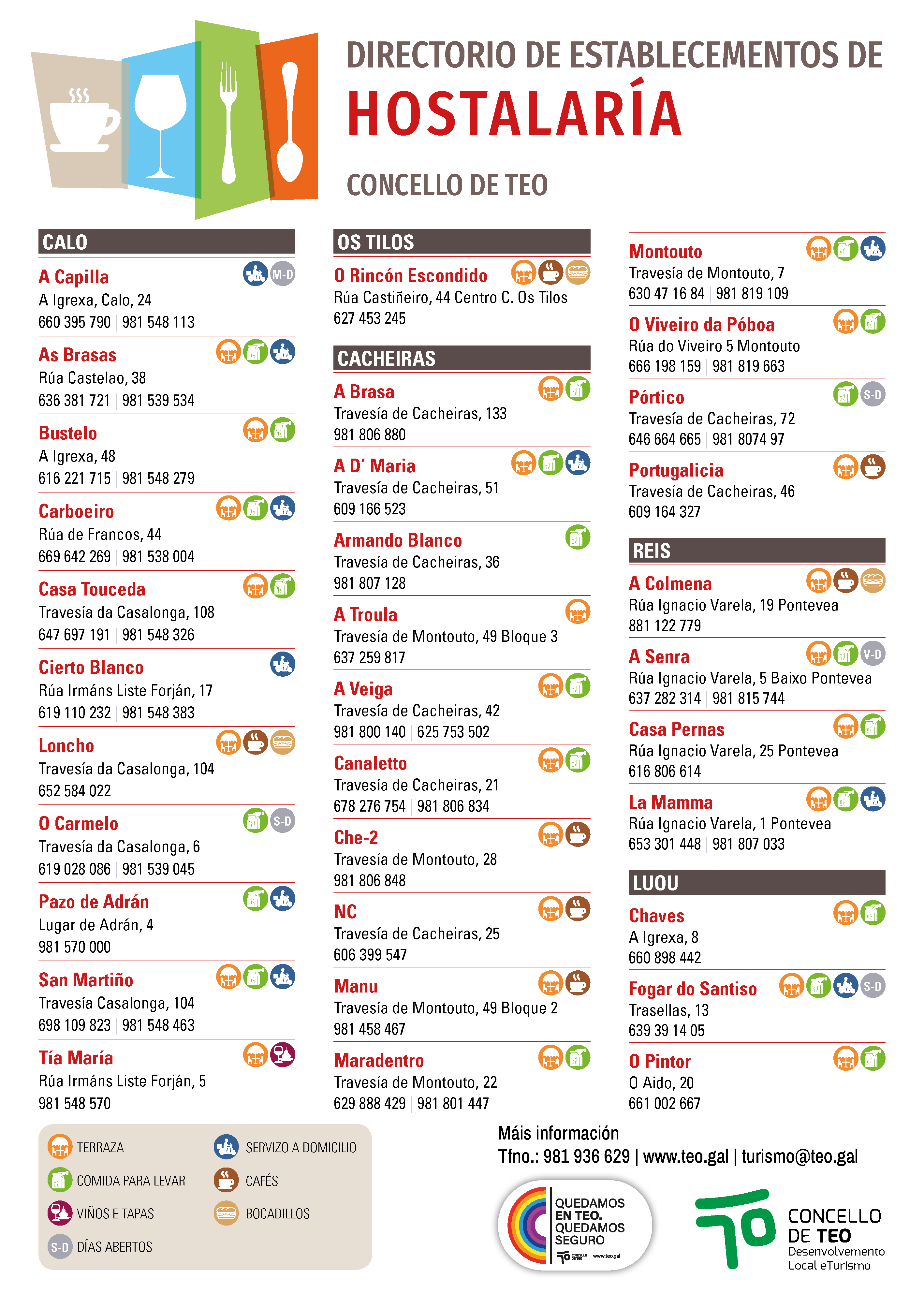 As restricións sanitarias actuais obrigan a que a hostalaría estea pechada e só pode ter servizo de recollida ou a domicilio. Unhas medidas establecidas dende o 27 de xaneiro ao 17 de febrerio. Con este directorio todos temos nunha imaxe os datos de contacto dos locais de Teo que siguen funcionando nesta modalidade. "Non podemos consumir nos locais pero podemos seguir consumindo, e hoxe máis ca nunca debemos facer deste xesto algo responsable e solidario co noso sector hostaleiro máis próximo" indica María López, concelleira de Comercio e Turismo.