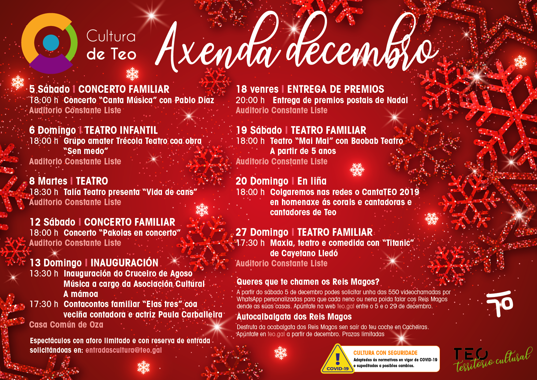Concurso de Postais: convócase a vixésimo primeira edición do Concurso de Postais: Debuxa o Nadal, onde os nenos e nenas de Teo demostran a súa linguaxe artística, as súas vivencias, intereses, emocións e desexos arredor do Nadal. O prazo para a presentación de postais iníciase o 25 de novembro e remata o 11 de decembro de 2020. Os traballos poden presentarse no Departamento de Cultura do Concello (de 8:00 a 15:00 h), na Biblioteca do Grilo, na Biblioteca dos Tilos ou nos centros educativos do concello como é habitual. Os premios do concurso entregaranse nun acto con capacidade restrinxida que terá lugar o 18 de decembro ás 20:00 horas no Auditorio da Ramallosa.