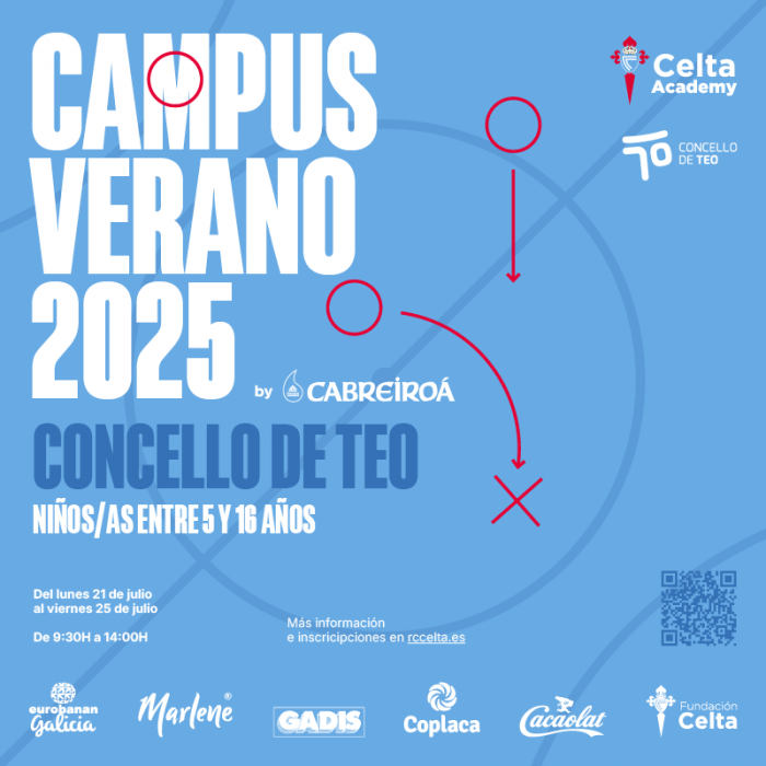 Xa podedes anotarvos no Campus de Verán Celta Academy 2025, que se levará a cabo no Campo Municipal da Cañoteira, en Cacheiras, na semana do 21 ao 25 de xullo. Está organizado pola Fundación Celta en colaboración co Concello de Teo.