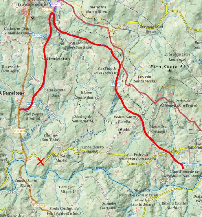 No caso dos vehículos pesados, deben continuar por esta estrada ata o enlace coa AG-59 nos Verxeles ou ben acceder no enlace de Ponte Ulla da AP-53 ata a AG-59.