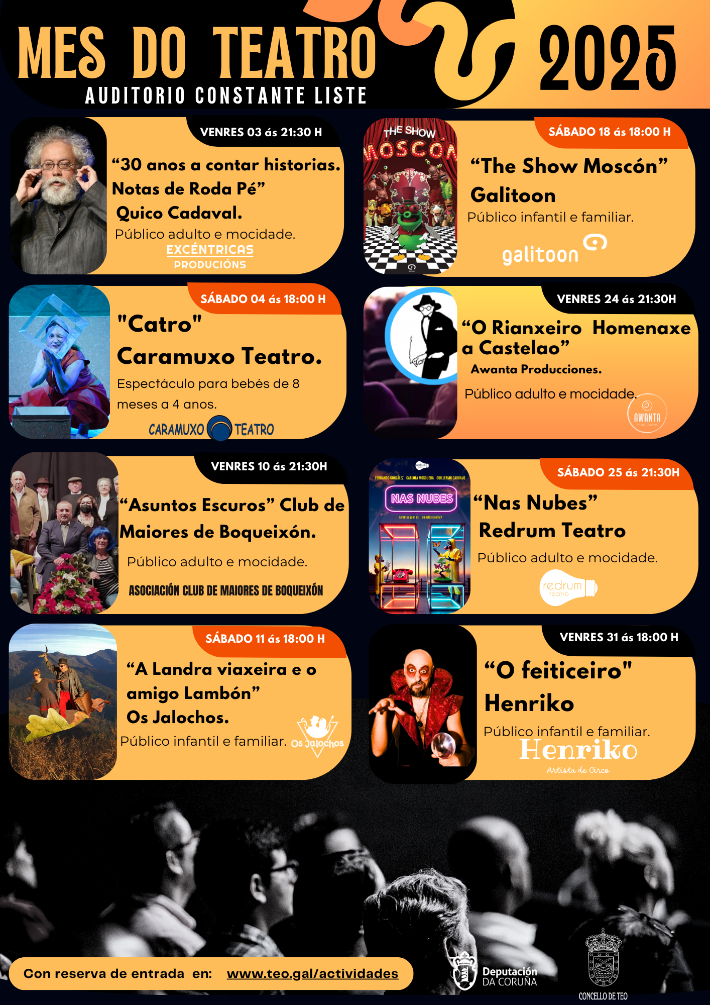 O Concello de Teo dara comezo ao tradicional Mes de Teatro, unha cita anual coa escena que se celebra durante os fins de semana do mes de outubro. Nesta edición, a programación chega cargada de propostas diversas, pensadas para todos os públicos: desde bebés, rapazada e familias ,pasando pola mocidade,  persoas adultas e o público sénior.