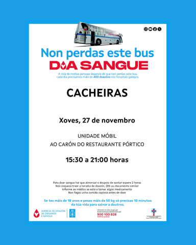 A unidade móbil de doazón de sangue estará o vindeiro xoves, 27 de novembro, en Teo. Concretamente, de 15.30 a 21.00 horas ao carón do restaurante Pórtico.