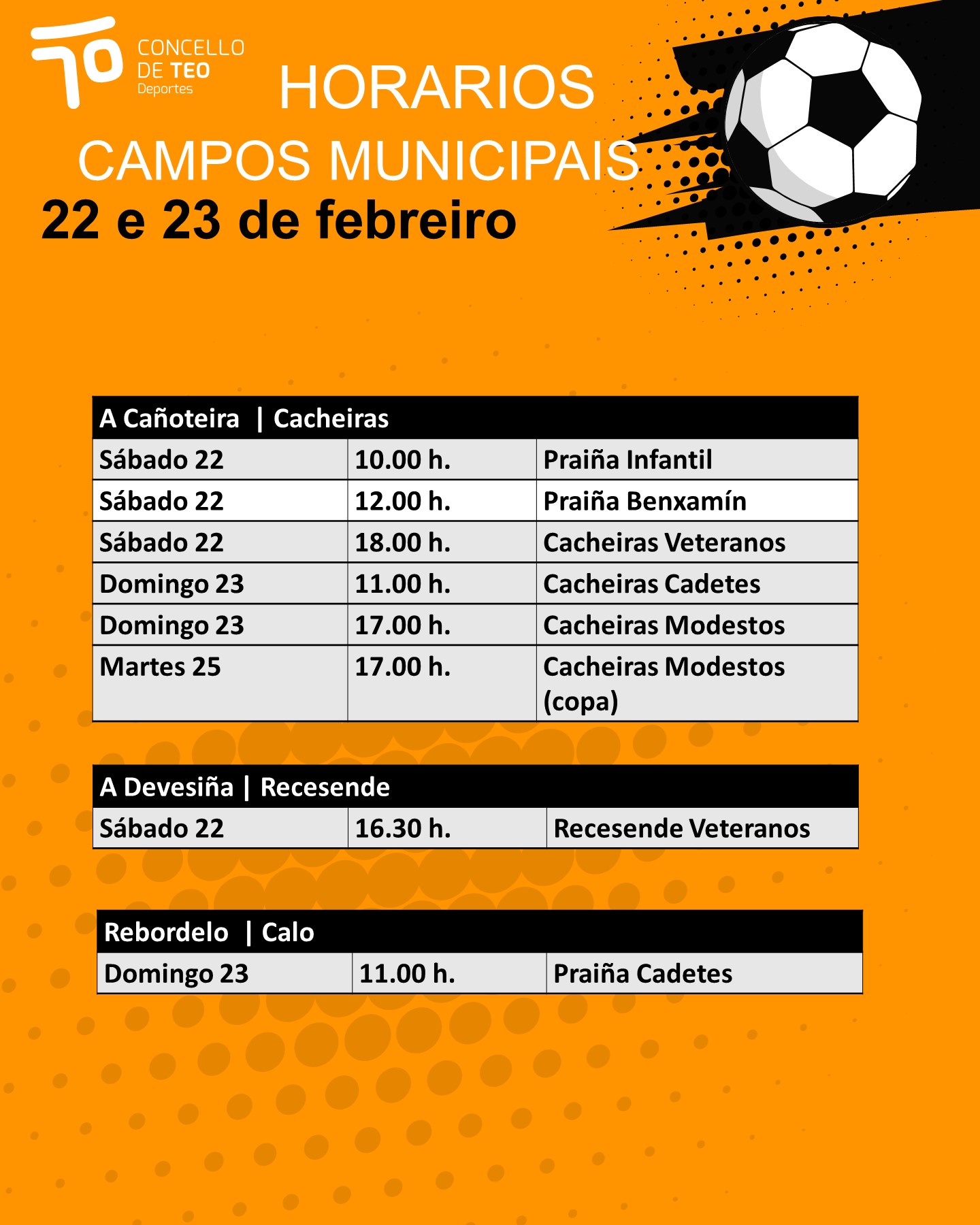 Publícanse os horarios dos partidos da fin de semana do 22 e 23 de febreiro nos campos de fútbol municipais. Podes consultar aquí os horarios. Mostrar en Portal Transparencia Non Data do evento Domingo 23-02-2020
