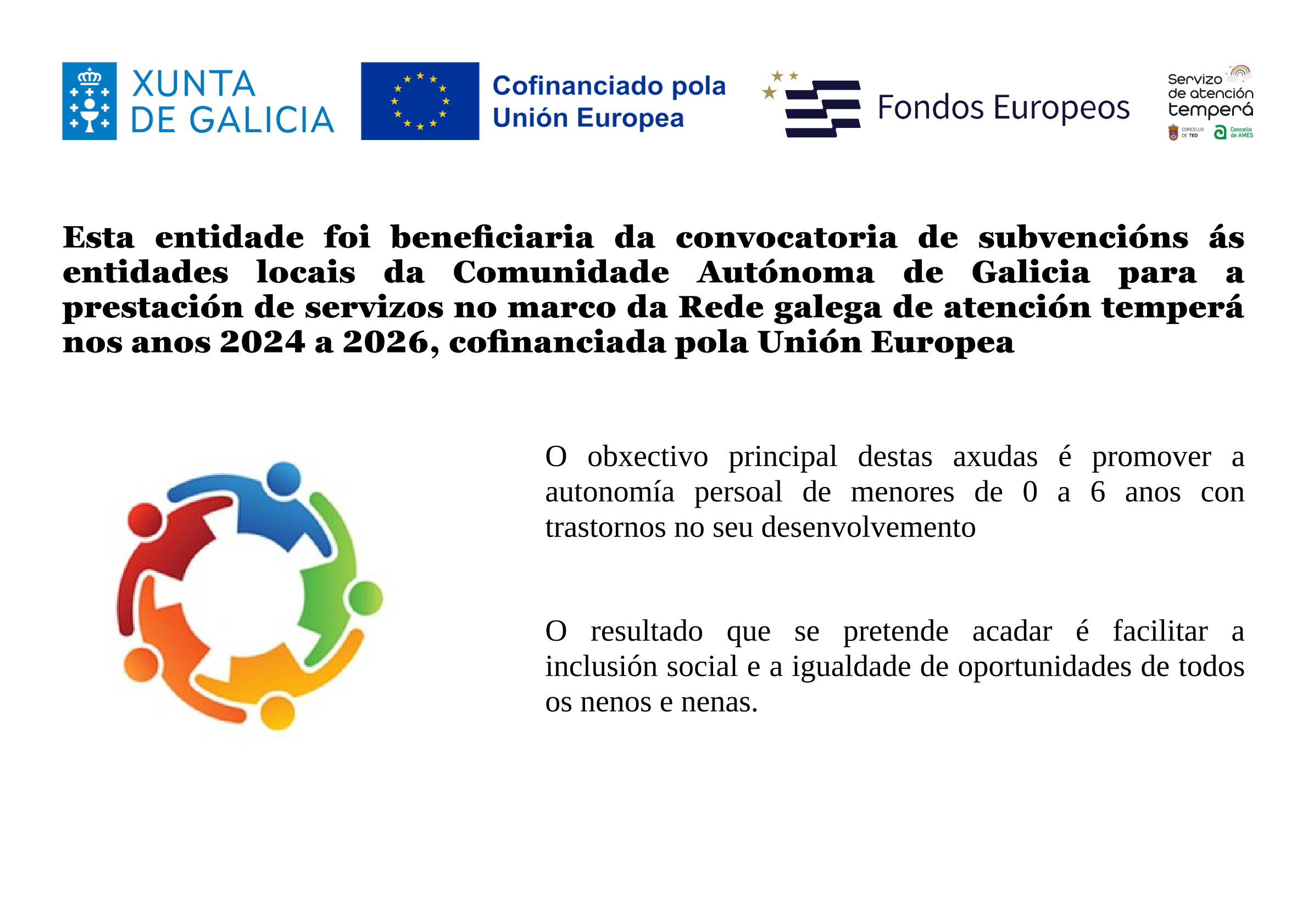 Teo pon en funcionamento no ano 2018 o servizo de atención temperá. En 2021, tras a sinatura do correspondente convenio de colaboración entre os Concellos de Teo e Ames bota a andar o SAT conxunto para atención á poboación destes dous municipios. A xestión compartida permite dar un salto de calidade no que respecta ao horario de apertura e ás instalacións nas que se desenvolve a atención.
