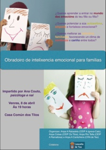 Mañá venres 8 de abril ás 19:00 horas terá lugar un obradoiro sobre intelixencia emocional dirixido ás familias na Casa Común dos Tilos. Con esta xornada formativa, impartida pola psicóloga e nai Ana Couto e desenvolvida polas ANPAs da Rabadela (CEIP A Igrexa-Calo), Cobas (CEIP Os Tilos), Río Tella (CEIP A Ramallosa) e A Cantoñeira (CRA de Teo), quérese axudar aos pais e nais a entrar no mundo das emocións dos seus fillos e fillas, utilizando a intelixencia emocional, unha capacidade que nos permite coñecer e manexar os nosos sentimentos e os dos demais con eficiencia.