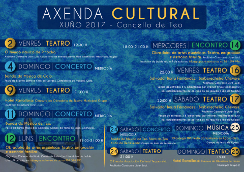 A Axenda Cultural do mes de xuño no Concello de Teo comeza o venres 2 ás 19:30 horas con "O mundo máxico de Pinocho" no Auditorio Constante Liste. É necesario a reserva de entrada previa (podes premer aquí para mais información). O domingo 4 ó mediodía, actuación da Banda de Música S.R. San Xoán de Calo na Carballeira de Francos na Festa do Espírito Santo e Virxe de Lourdes. O venres 9, clausura do Obradoiro de Teatro Municipal (Grupo I) no Auditorio Constante Liste representando Hotel Ramallosa. O domingo 11 concerto da Banda de Música Cultural de Teo ó mediodía no Campo da festa de Raxó dentro das celebracións pola Festa de Santa María das Cabezas.
