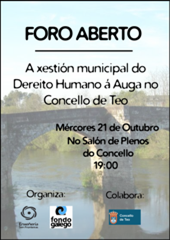 Enxeñería sen Fronteiras organiza mañá mércores en Teo o foro aberto ‘A xestión municipal do dereito humano á auga’, que terá lugar ás 19 horas no salón de plenos, coa colaboración do Concello. A actividade está vinculada ao proxecto que a ONGD desenvolve en Honduras para mellorar o acceso á auga potable co apoio do Fondo Galego de Cooperación e, polo tanto, do consistorio teense, que forma parte desta rede solidaria de municipios e deputacións.