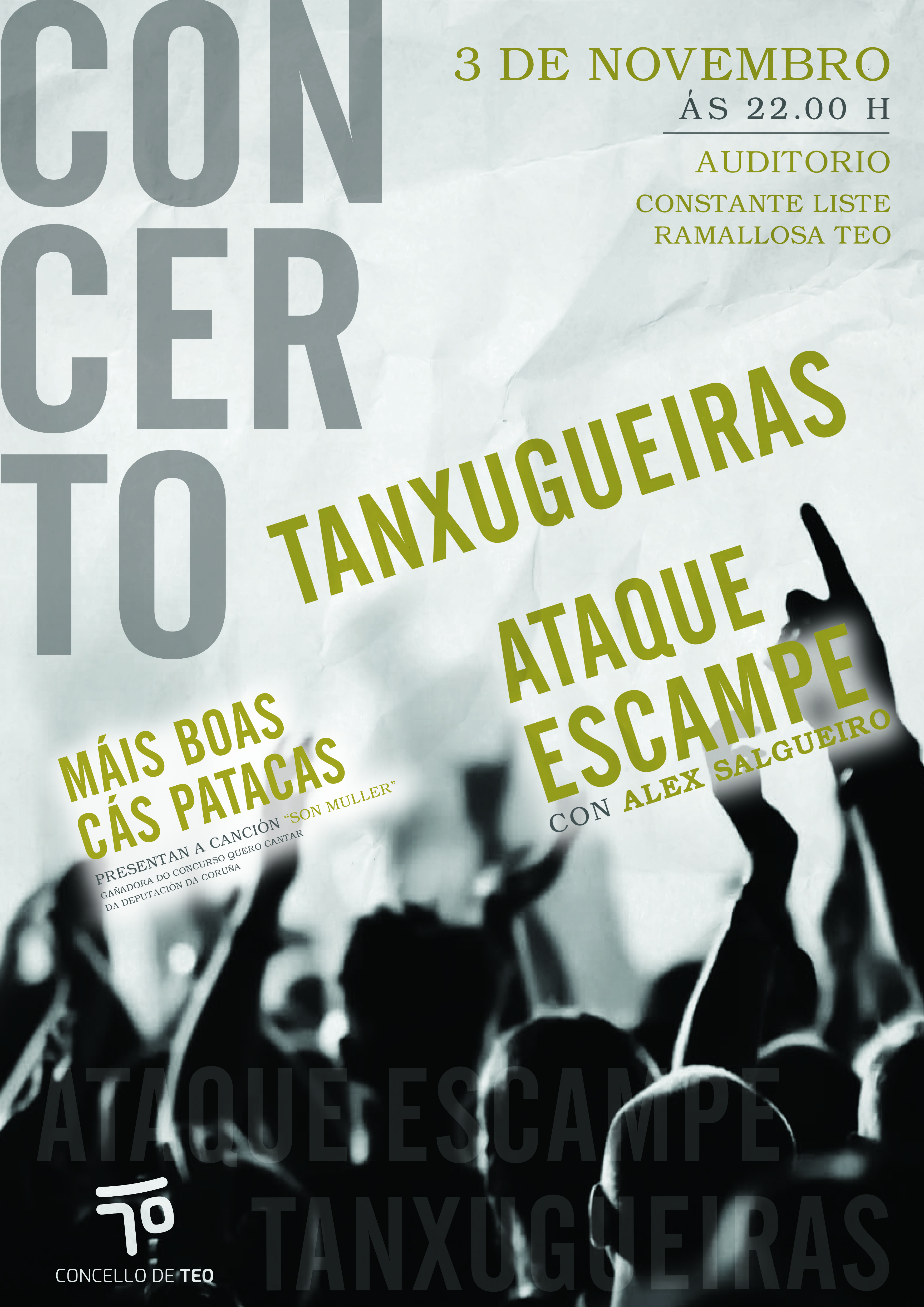 A programación cultural comeza o 3 de novembro cun concerto no que actúan As Tanxugueiras e Ataque Escampe e Álex Salgueiro. Estas actuacións serán no Auditorio Constante Liste da Ramallosa o venres 3 ás 22:00 horas e será de balde ata completar aforo. Durante esta noite haberá unha sorpresa xa que contaremos coa actuación do grupo de escolares do IES de Cacheiras Máis boas cás patacas que veñen de gañar o concurso Quero cantar organizado pola Deputación da Coruña coa canción Muller. O concerto terá un presentador de luxo, Monti Castiñeiras.