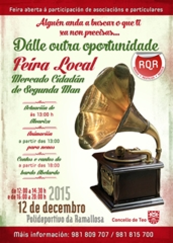 O Concello de Teo organiza a Feira local de segunda man o próximo sábado 12 de decembro. Trátase dun mercado cidadán aberto á participación de asociacións e particulares e realizarase no pavillón polideportivo da Ramallosa. Calquera entidade ou persoa interesada en participar pode pórse en contacto co departamento de participación veciñal, que coordina a actividade, nos seguintes números de teléfono: 981 809 707 ou 981 815 700.