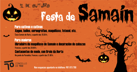 O Concello de Teo organiza unha festa para celebrar o Samaín o próximo martes 31 de outubro. Esta celebración terá unha parte dirixida aos nenos/as e outras actividades para adultos.