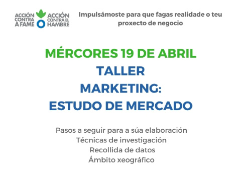 O Vives Emprende organiza un taller de "Márketing: estudo de mercado" o mércores 19 de abril na aula de formación da Casa Común de Oza. As persoas interesadas en asistir a este taller poden contactar con Itziar Villar, a técnica de emprendemento encargada do mesmo, no teléfono 630 639 649 ou no seguinte correo electrónico: ivillar@accioncontraelhambre.org