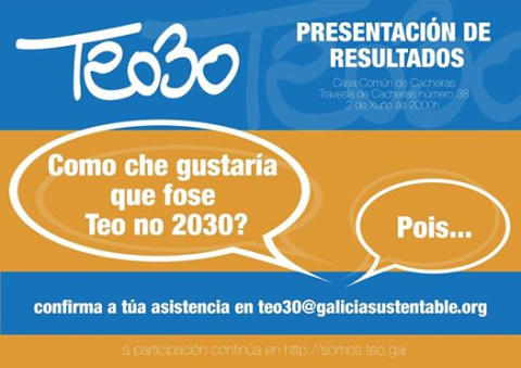 A presentación terá lugar no local social que o Concello ten en Cacheiras (Travesía de Cacheiras número 38) o vindeiro 2 de xuño ás 20:00 h. En aproximadamente 40 minutos establecerase a base científica deste traballo por parte da Doutora Leticia Bas que dará paso a Marcos Pérez, da Fundación Galicia Sustentable para que comparta os resultados do proceso. Pechará a presentación a concelleira de Urbanismo, Uxía Lemus. Tras a presentación, a iso das 20:40 h crearase un espazo distendido para o encontro e para falar do Teo que queremos construír colectivamente cara o 2030.