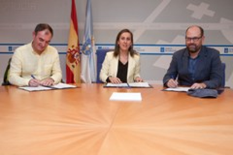 O alcalde de Teo, Rafael Sisto, o rexedor de Compostela, Martiño Noriega, e a Conselleira de Medio Ambiente, Territorio e Infraestruturas, Ethel Vázquez, asinaron o convenio de colaboración para a coordinación dos servizos de transporte público con orixe ou destino na urbanización dos Tilos.