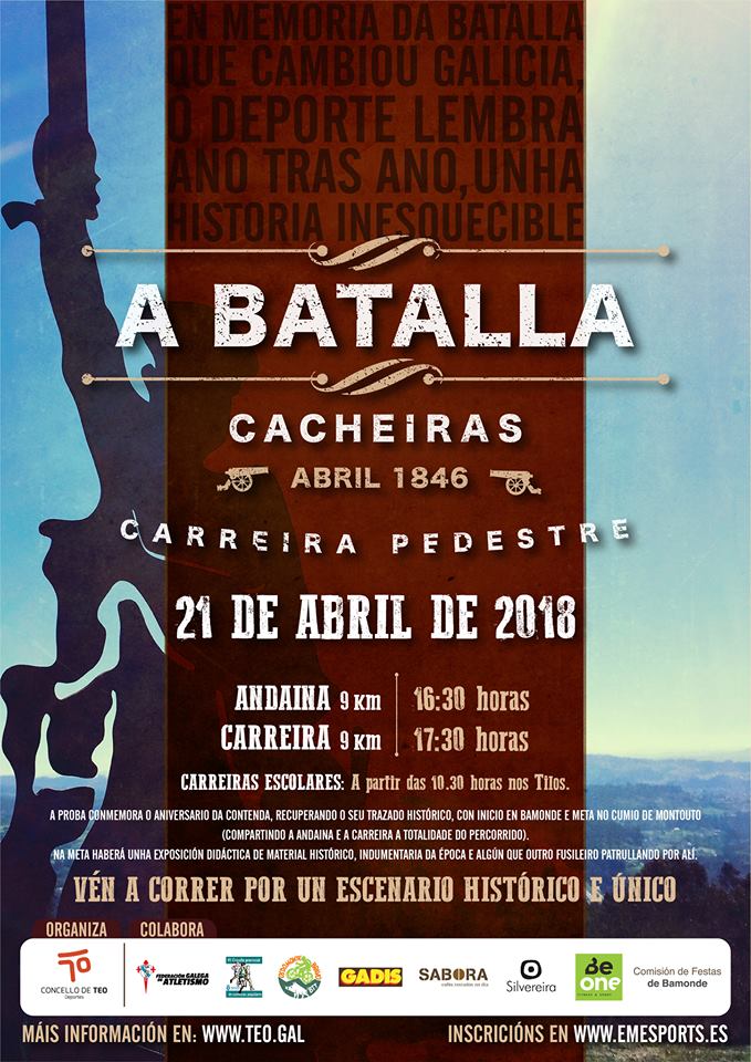 A Carreira Pedestre Batalla de Cacheiras 2018, que organiza a Concellaría de Deportes de Teo, celébrase o 21 de abril, en conmemoración dos acontecementos históricos do 23 de abril de 1846. Trátase dunha proba deportiva que recupera un itinerario histórico na que se porá en valor a cultura e o territorio.