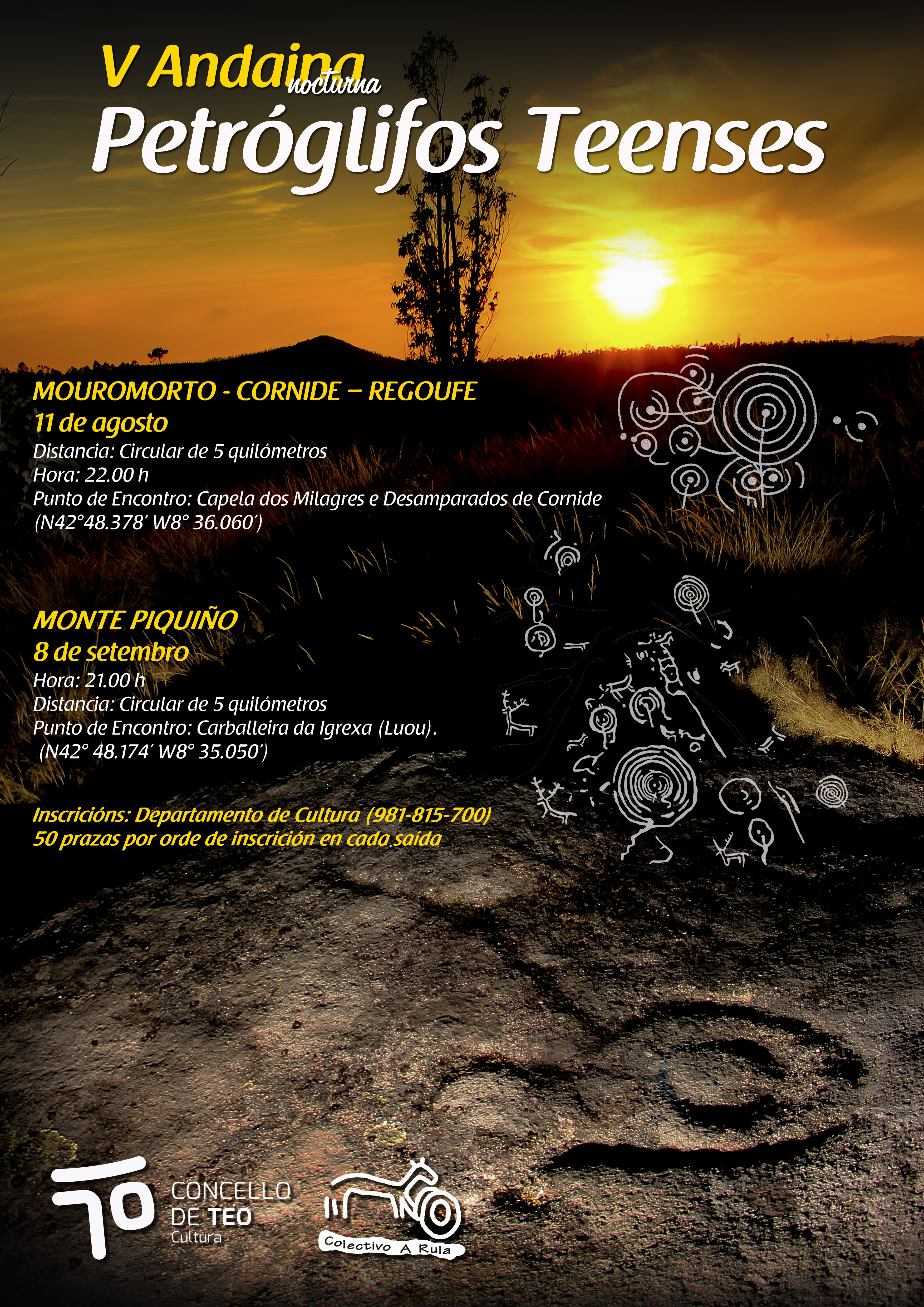 O sábado 11 ás 22:00 horas realízase a V andaina nocturna polos petróglifos teenses, actividade en colaboración co colectivo A Rula. Será unha ruta circular de cinco quilómetros dende Mouromorto, pasando por Cornide e Regoufe. O punto de encontro será a capela de Cornide (coordenadas GPS N42º 48.378´ W8º 36.060´)