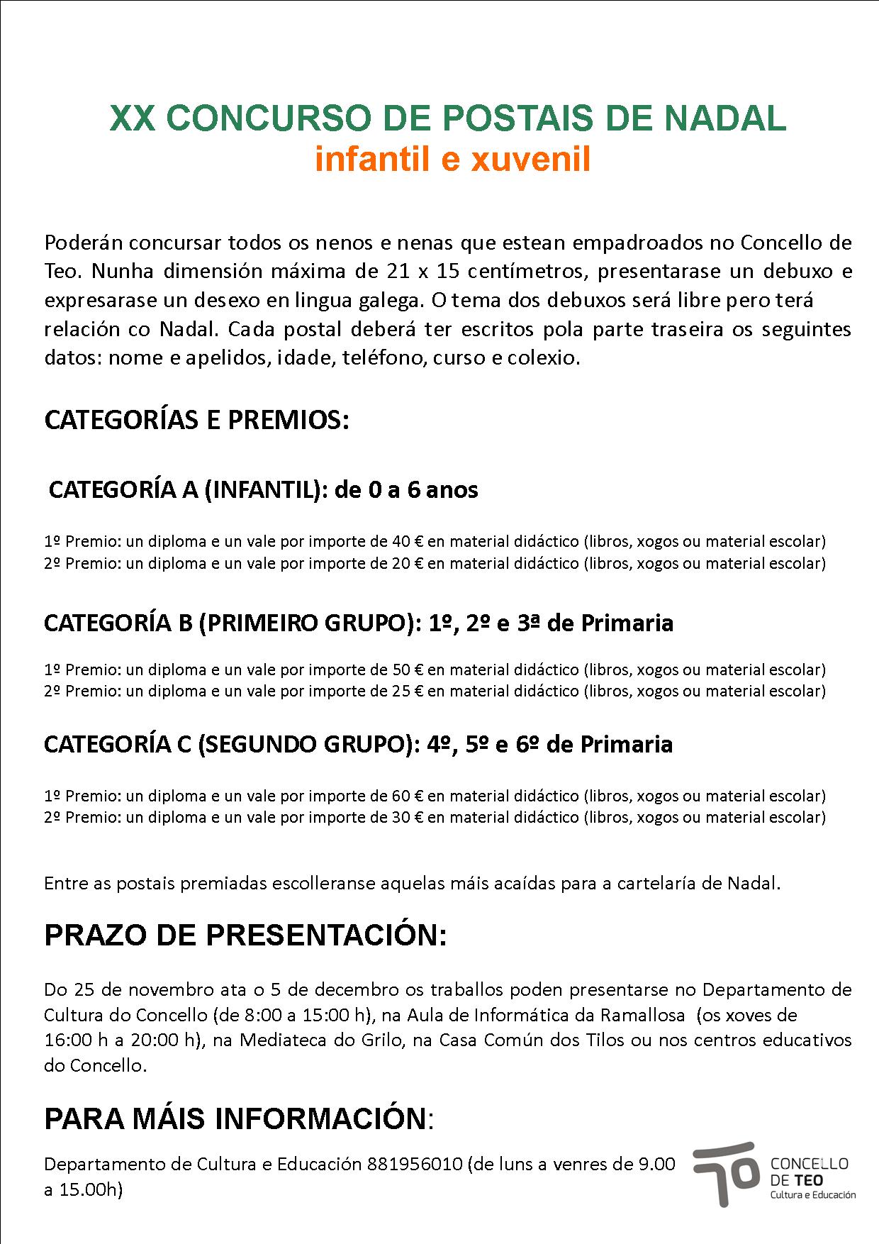 O Concello de Teo convoca a vixésima edición do Concurso de Postais de Nadal infantil e xuvenil. O certame pretende que os nenos e as nenas comuniquen a través da linguaxe artística as súas vivencias, intereses e emocións relativas ao Nadal.