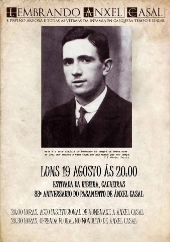 Ánxel Casal (A Coruña, 1895-Cacheiras, 1936) destacou polo seu labor como editor e político. O que é o último alcalde republicano da cidade de Santiago militou no Partido Galeguista desde a súa creación. Tras o triunfo do golpe de estado do 18 de xullo de 1936, Casal foi detido e paseado o 19 de agosto. O seu corpo apareceu a carón da estrada en Cacheiras, onde agora se erixe o monólito na súa memoria.