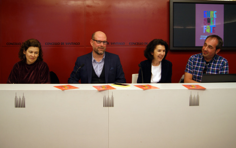 A concelleira de Cultura, Pilar Faxil, o alcalde de Santiago, Martiño Noriega, a concelleira de Ames, Isabel Vaquero e o regueifeiro Manolo Maseda, presentaron hoxe a nova edición do proxecto Enreguéifate. Na presentación explicouse que este programa quere aproveitar o rexurdir que está a experimentar a regueifa e utilizar o seu enorme potencial como ferramenta para que os mozos e as mozas se animen a expresárense en galego.