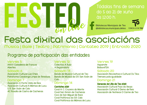 Polo tanto, un ano máis aínda que de xeito diferente, o Festeo recollerá a actividade cultural dos colectivos teenses e virá cargado de música, baile, teatro, patrimonio, xunto cos vídeos integrais do Cantateo 2019 e os Entroidos 2020.