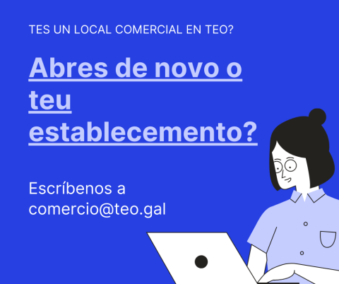 Se tes un establecemento comercial en Teo escribe a comercio@teo.gal e indica no asunto da mensaxe APERTURA. No correo indica o nome do comercio, o enderezo e o sistema de contacto (teléfono e/ou enderezo electrónico) no caso de utilizar a cita previa na reapertura. Se precisas facer algunha consulta telefónica sobre este asunto podes chamar ao teléfono 604080470.