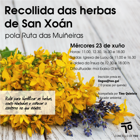 Ademais, as persoas que participen nela recibirán a guía impresa Recollida das herbas de San Xoán pola Ruta das Muiñeiras, que servirá de apoio para identificar as herbas e saber como se nomean comunmente. A guía pretende axudar para identificar ata 9 herbas das que habitualmente se recollen polo San Xoán e que se encontrarán con facilidade na ruta das Muiñeiras, xa que cada planta vai acompañada dunha ilustración que axudará á súa identificación. Así mesmo, tamén a acompaña unha breve descrición, o seu nome científico e unha escolma das diferentes maneiras de nomealas que existen espalladas polo territorio.