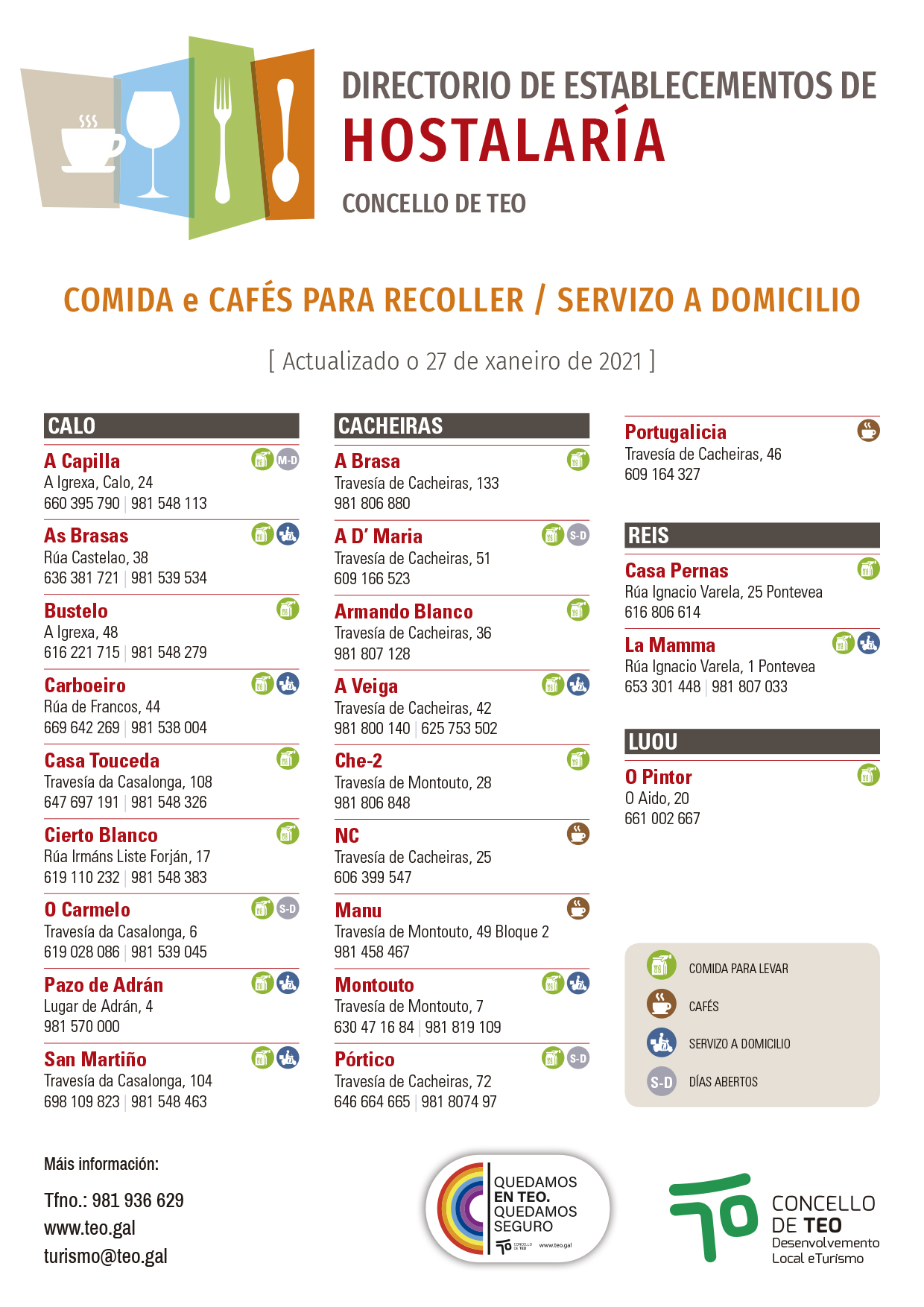As restricións sanitarias actuais obrigan a que a hostalaría estea pechada e só pode ter servizo de recollida ou a domicilio. Unhas medidas establecidas dende o 27 de xaneiro ao 17 de febrerio. Con este directorio todos temos nunha imaxe os datos de contacto dos locais de Teo que siguen funcionando nesta modalidade. "Non podemos consumir nos locais pero podemos seguir consumindo, e hoxe máis ca nunca debemos facer deste xesto algo responsable e solidario co noso sector hostaleiro máis próximo" indica María López, concelleira de Comercio e Turismo.