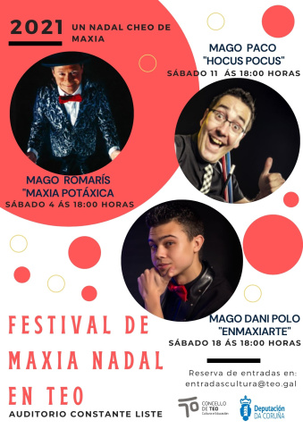 Os sábados do mes de decembro serán sábados máxicos en Teo. Teremos Festival de Maxia co Mago Romarís, co Mago Paco e con Dani Polo. Esta actividade, dirixida especialmente a un público familiar será os sábados 4, 11 e 18 deste mes na Ramallosa, no Auditorio Municipal Constante Liste. Todas as funcións serán ás 18:00 horas. A entrada será de balde pero é convinte reservar entrada escribindo a entradascultura@teo.gal indicando os datos persoais dos asistentes así coma un número de teléfono de contacto.