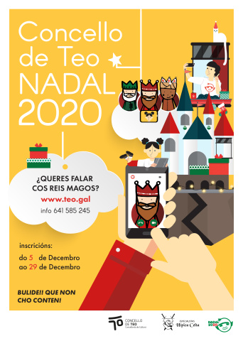 Videoconferencia en directo cos reis magos: Queres que te chamen os Reis Magos?: A partir do sábado 5 de decembro podes solicitar unha das 550 videochamadas por WhatsApp personalizadas para poder falar cos Reis Magos dende as súas casas. Para poder apuntarte deberás acceder a teo.gal entre o 5 e o 29 de decembro e escoller a hora e día da videochamada entre o 30 de decembro e o 5 de xaneiro. Apuntamento por orden de entrada na web do Concello ata completar as 550 entradas. Para pedir a túa videochamada podes premer no banner principal da web coa imaxe do Nadal cultural. Unha vez premes tes que seleccionar provincia e concello. Cando xa tes seleccionado Teo aparece un calendario no que debes elexir día e hora para que te chamen. Podes entrar tamén premendo aquí