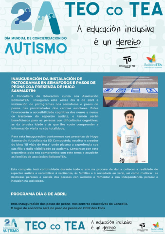 A campaña Teo co Tea impulsada pola Concellaría de Educación en colaboración coa Asociación BolboreTEA continúa este xoves 8 de abril coa instalación de pictogramas nos pasos de peóns dos colexios. Mañá farase un acto público no entorno do CEIP dos Tilos e contaremos coa presenza de Hugo Sanmartín, futbolista da SD Compostela e divulgador da realidade das persoas con TEA.