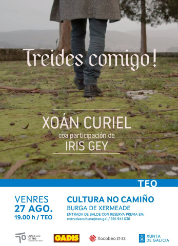 Xoán Curiel presenta o seu novo disco, Treides comigo!, en Teo. Será o 27 de agosto na Burga de Xermeade ás 19:00 horas. A actuación contará coa participación de Iris Gey e traen unha proposta chea de maxia e lirismo nun dos espazos naturais do Concello de Teo máis fermosos. A entrada é de balde pero hai que reservar no teléfono 981.941.036 ou escribindo a entradascultura@teo.gal.