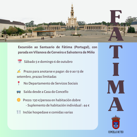 A partir do luns 9 de setembro, e ata o venres 13, as persoas maiores de 60 anos e empadroadas no concello de Teo poderán anotarse á excursión que organiza o Consistorio ao Santuario de Fátima, situado en Portugal. A data da viaxe ao país veciño será o sábado 5 e domingo 6 de outubro. Os interesados poderán achegarse ata o Departamento de Servizos Sociais para facer efectiva a inscrición.