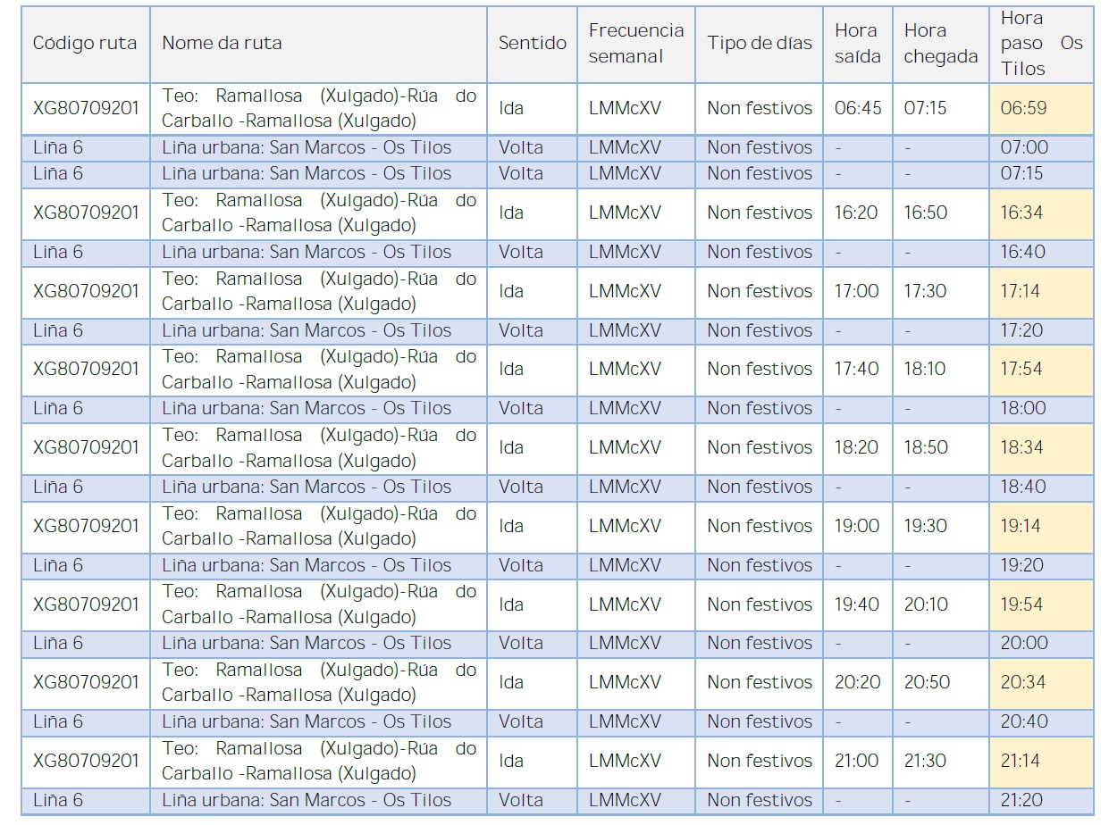 Así, ofrécense nove servizos ao día de luns a venres laborables. O primeiro sairá ás 06,45 horas da Ramallosa e outros oito serán pola tarde, das 16,20 ata as 21,00 horas cunha frecuencia de 40 minutos. Coa expedición da primeira hora da mañá amplíase o horario do servizo de interese municipal de Teo, que comezaba ás 07,20 horas, e permite aos usuarios coller os primeiros autobuses das liñas 6 e 12 do transporte urbano de Santiago, que saen dos Tilos ás 07,00 horas e ás 07,15 horas.
