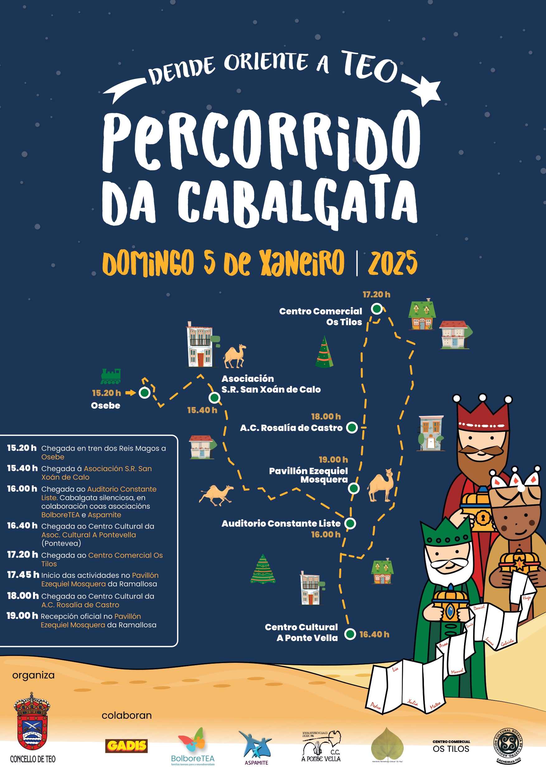 Este domingo regresan a Teo as súas maxestades de Oriente. Chegarán á estación de tren de Osebe o día 5 ás 15,20 horas e despois farán un percorrido polos locais das distintas asociacións (Calo, A Pontevella, Os Tilos e Rosalía de Castro) e, xa pola tardiña, farase a recepción oficial no Pavillón Ezequiel Mosquera da Ramallosa.