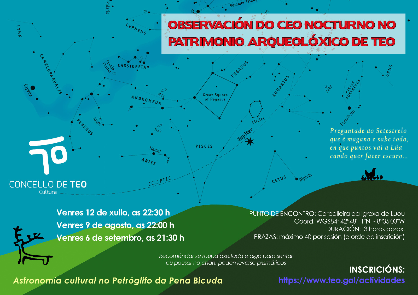 En relación coas observacións astronómicas haberá tres relacionadas co patrimonio cultural. Serán dende o petróglifo da Pena Bicuda e poderase ver o ceo con prismáticos e telescopios. As datas destas actividades serán o 12 de xullo ás 22:30 horas, o 9 de agosto ás 22:00 horas e o venres 6 de setembro ás 21:30 horas. O punto de encontro é na carballeira da Igrexa de Luou. A duración da actividade estímase entre dúas a tres horas.