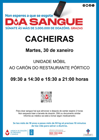 A unidade móbil de doazón de sangue estará o martes, 30 de xaneiro, en Cacheiras, ao carón do restaurante Pórtico. O horario de atención será de 9:30 a 14:30 horas e de 15:30 a 21:00 horas.