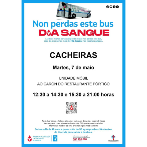 A unidade móbil de doazón de sangue estará o martes, 7 de maio, en Cacheiras, ao carón do restaurante Pórtico. O horario de atención será de 12.30 a 14.30 horas e de 15.30 a 21.00 horas.