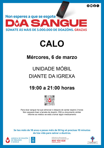 A unidade móbil de doazón de sangue estará o mércores, 6 de marzo, en Calo, diante da Igrexa. O horario de atención será de 19.00 a 21.00 horas.
