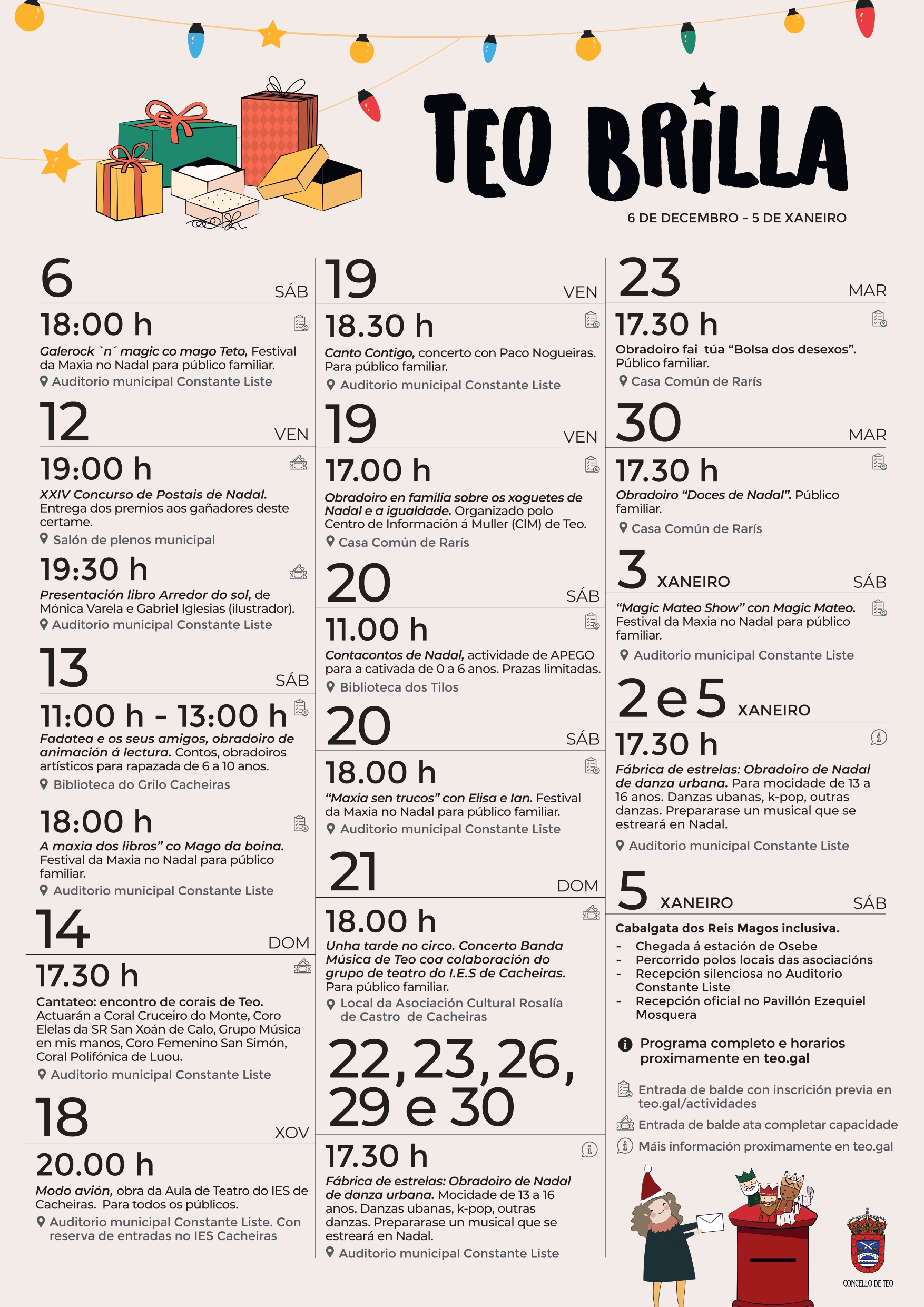 O Concello volve a programar numerosas actividades para todo o mes de decembro, coincidindo coas festas de Nadal, para grandes e pequenos, con actividades centradas na música e no baile, na maxia, no teatro e varios obradoiros. Todas as actividades son de balde, pero en moitas delas será preciso anotarse con antelación, polo que é importante que revisedes o apartado de actividades da web do Concello e vos anotedes o antes posible.