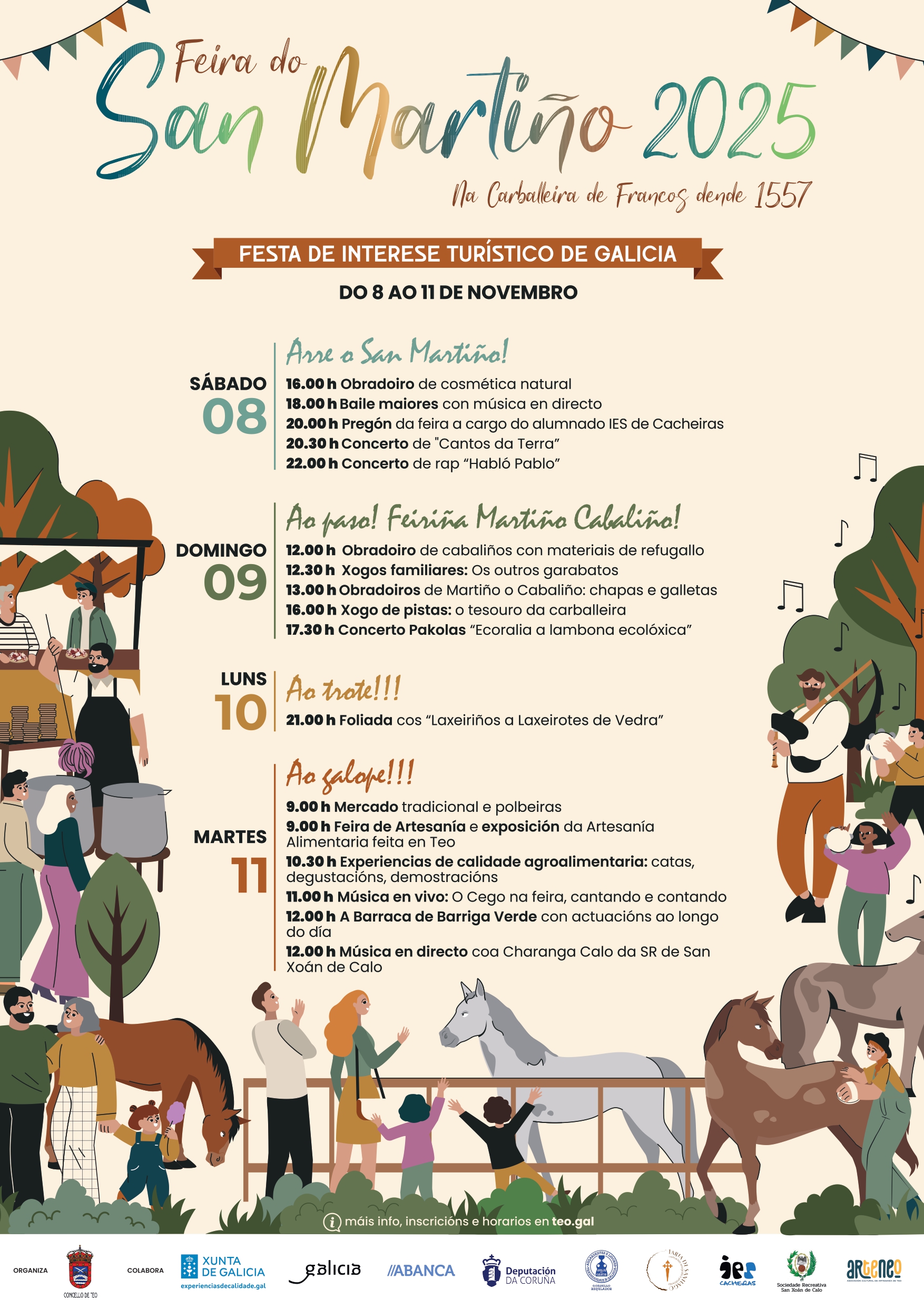 O Concello de Teo presentou hoxe unha nova edición da súa Feira do San Martiño 2025, declarada este ano como Festa de Interese Turístico de Galicia. Celebrarase os días 8, 9 e 11 de novembro na Carballeira de Francos, é dicir, onde fai máis de 500 anos que se leva celebrando.