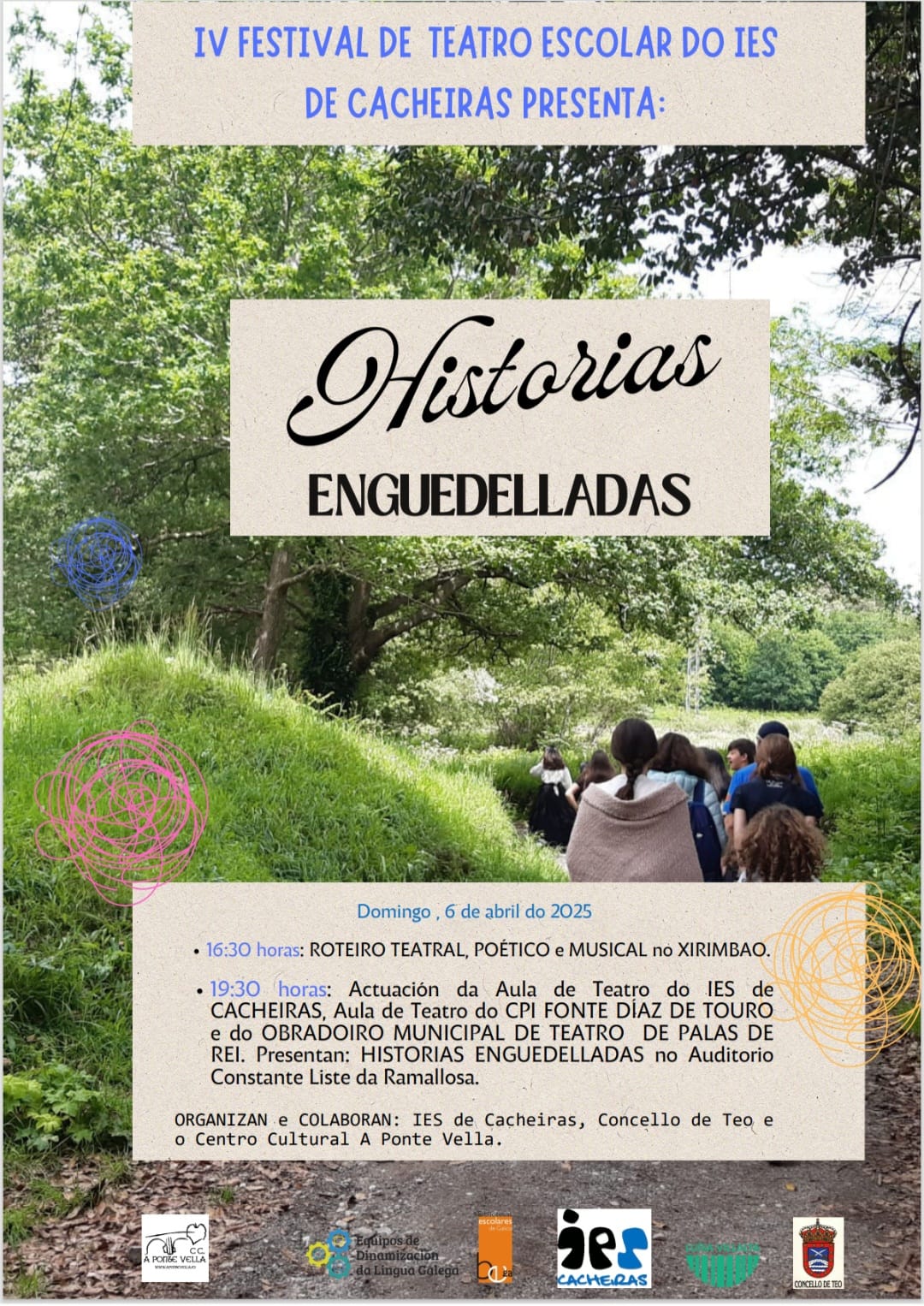 Ás 19:30 horas, no auditorio Constante Liste da Ramallosa, a Aula de Teatro do IES de Cacheiras, o Obradoiro Municipal de Teatro de Palas de Rei e a Aula de Teatro do CPI Fonte Díaz de Teatro porán en escena o espectáculo Historias Enguedelladas.