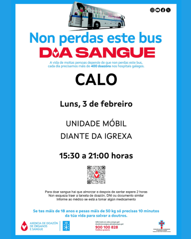 A unidade móbil de doazón de sangue estará o luns 3 de febreiro en Calo