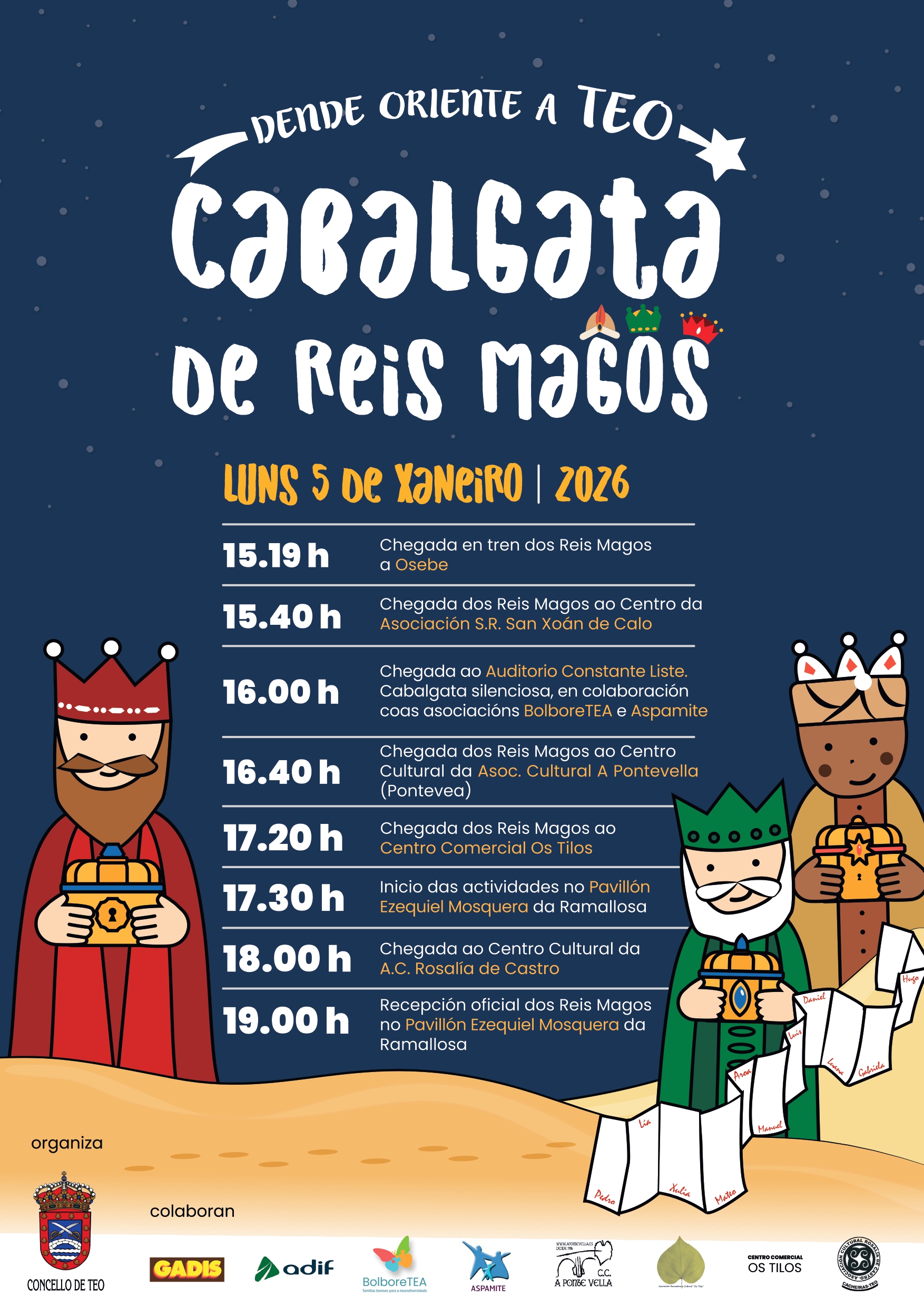 O vindeiro luns, día 5 de xaneiro, as súas maxestades de Oriente visitarán Teo, chegando á estación de tren de Osebe ás 15:19 horas do mediodía. Como de costume, farán un percorrido polos locais das asociacións, incluíndo a recepción silenciosa no Auditorio Constante Liste. Pola tardiña farase a recepción oficial no Pavillón Ezequiel Mosquera, na Ramallosa, e xa pola noite visitaran todos os fogares teenses.