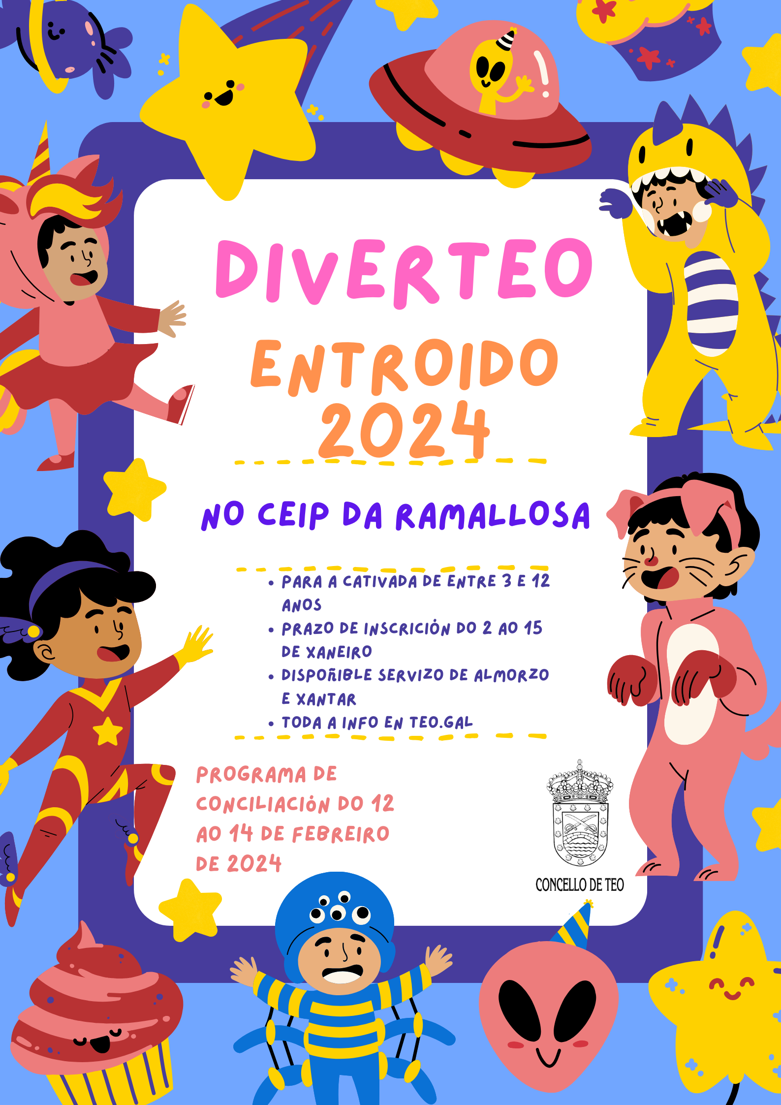 O Concello programa un ano máis o DiverTeo Entroido para a rapazada de entre 3 e 12 anos de idade. Trátase dun programa de conciliación para as crianzas escolarizadas nun centro de Educación Infantil e Primaria ou Colexio Rural Agrupado, tendo prioridade para a utilización deste servizo as familias empadroadas en Teo e por orde de inscrición.